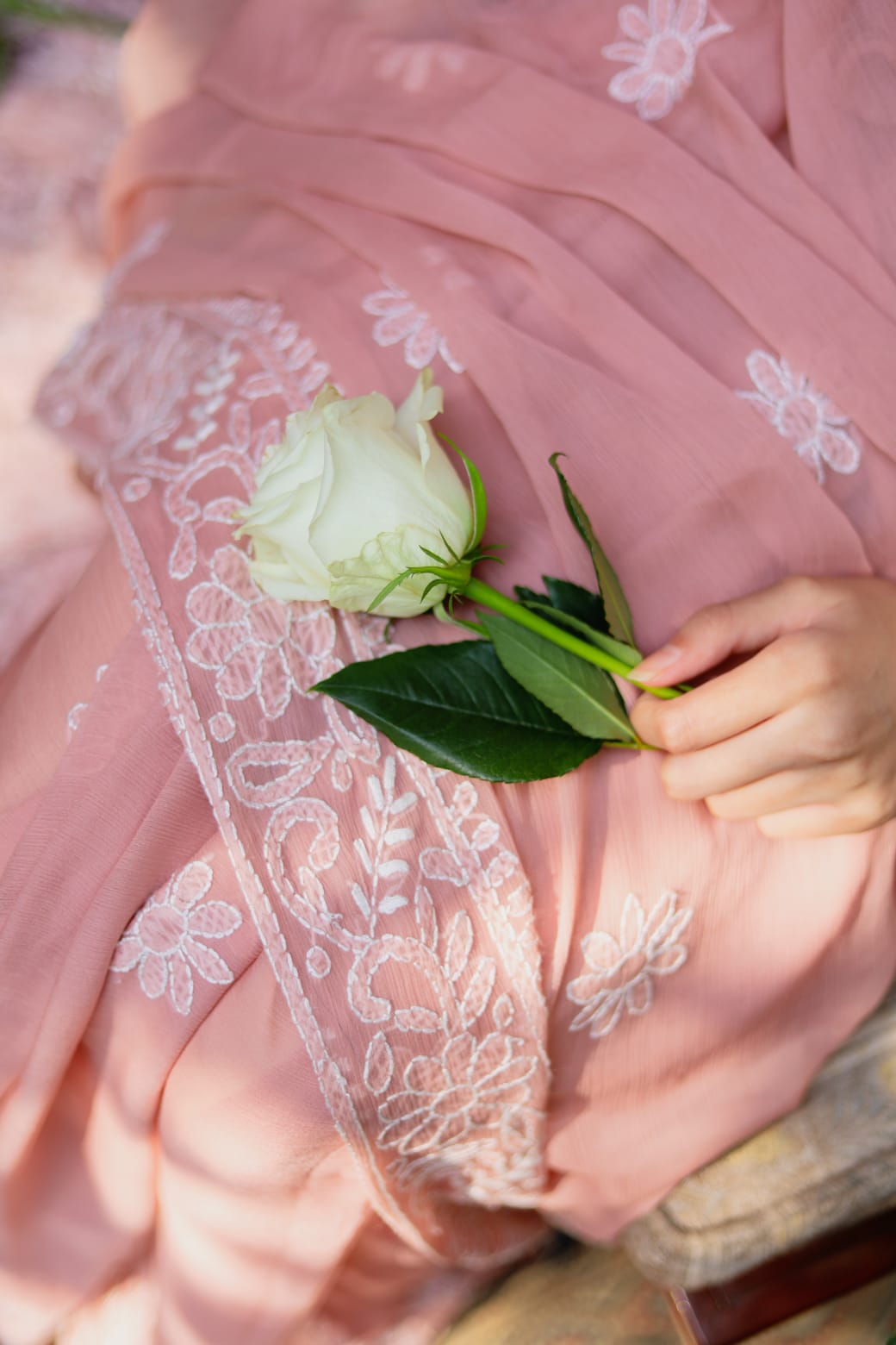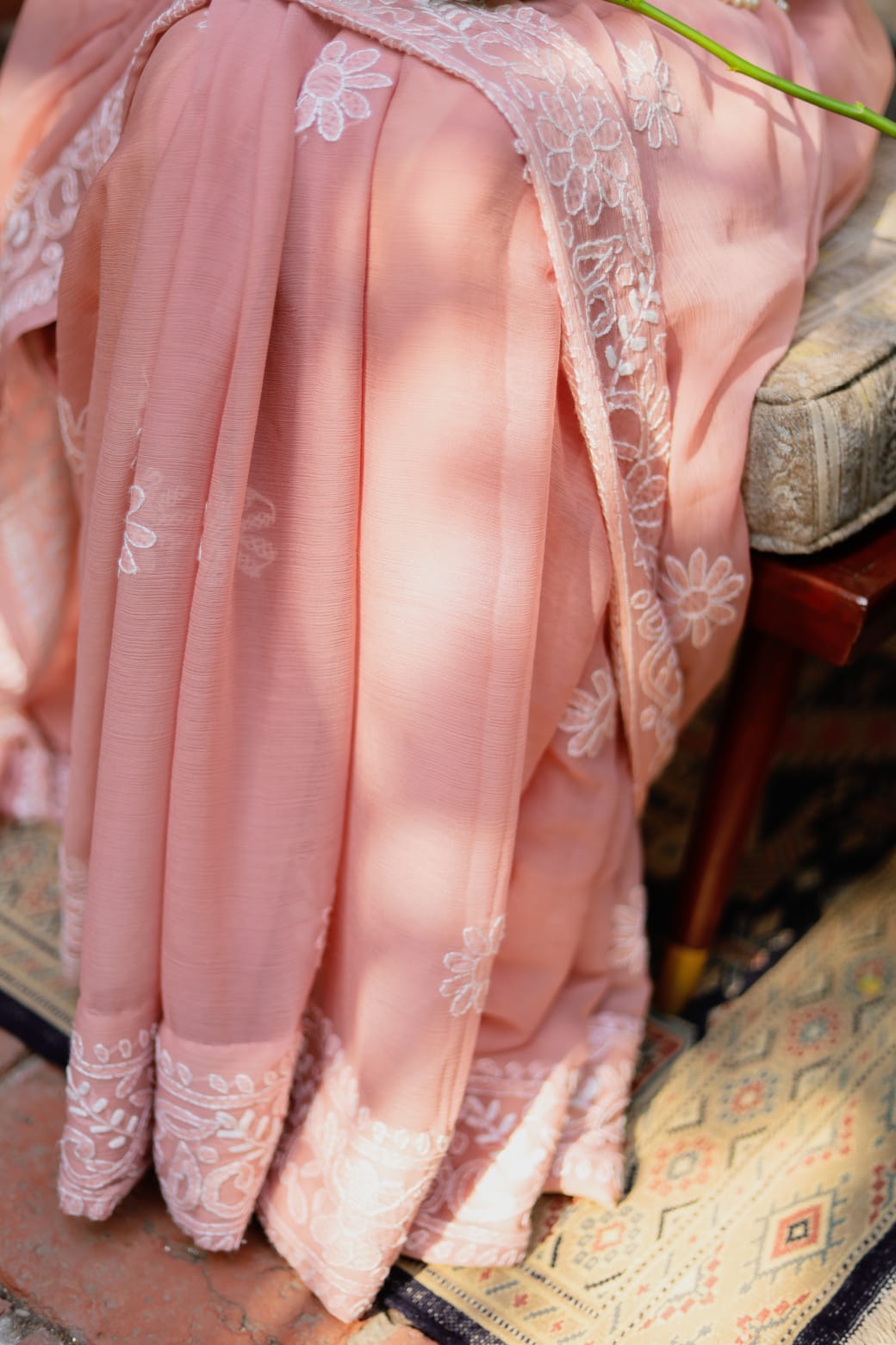 6-6.5 yards of beautiful handmade chiffon chikankari saree that represents the true culture of multani crafts. With an arz of 40-42 inches, this beautiful kashmiri pink color is all enough to make you look stunning this summer. This saree has embroidered borders, pallu and spray of flower motifs all over the saree.