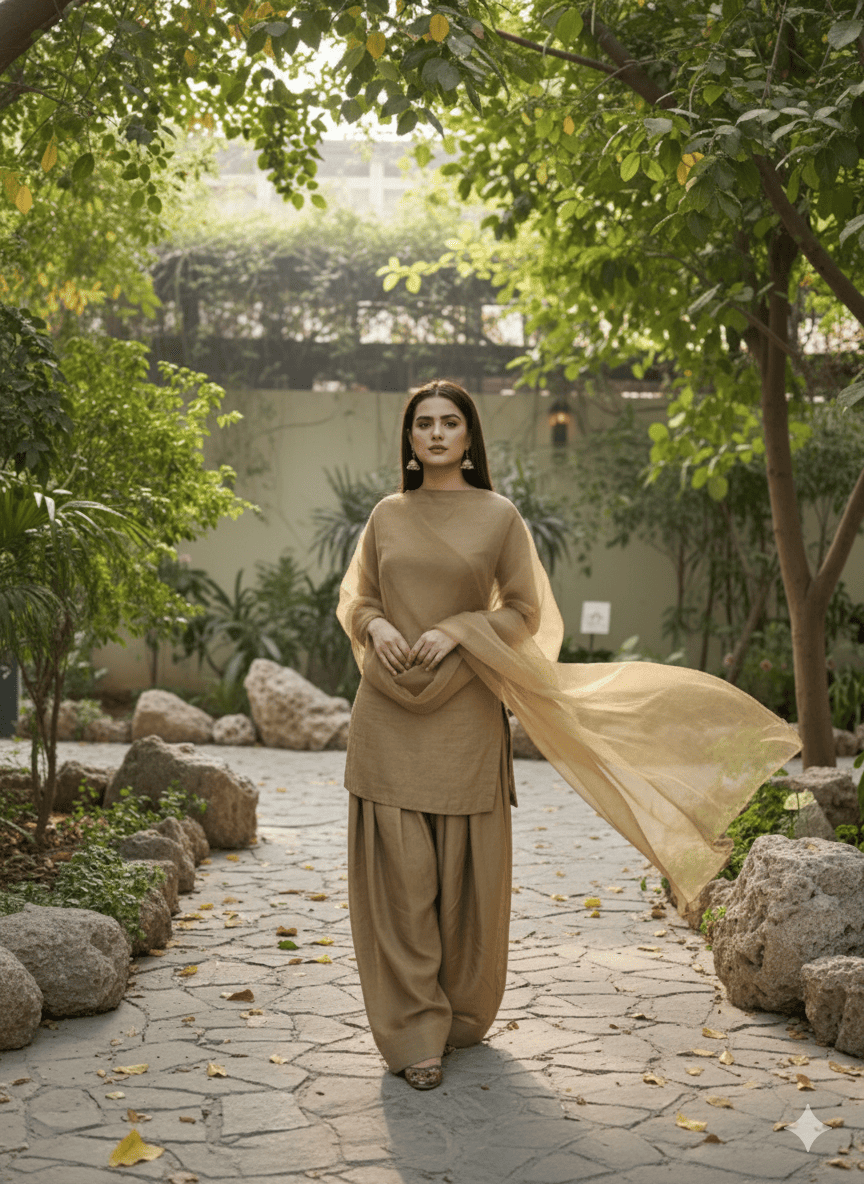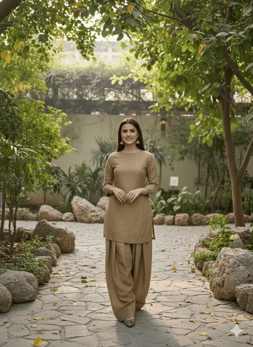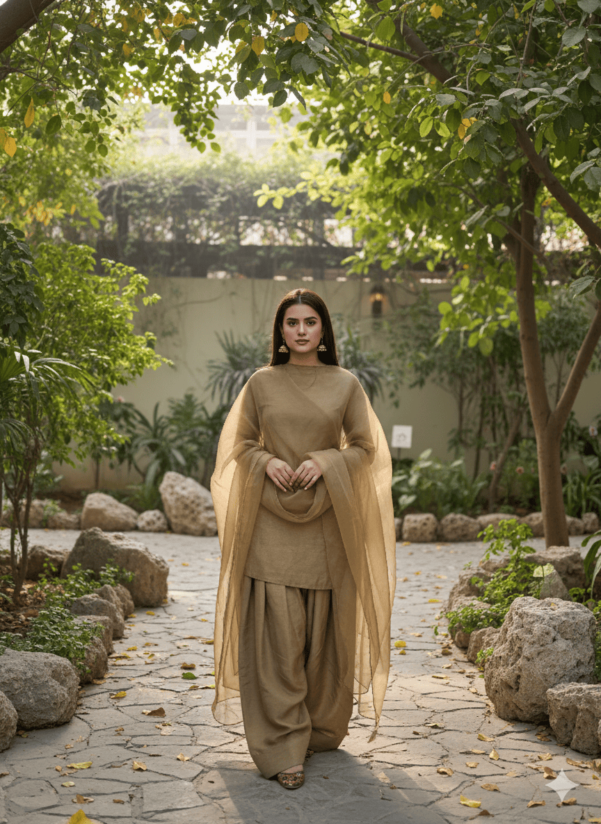Elevate your wardrobe with this timeless Farshi Shalwar Kameez set crafted in premium Tassel silk. Designed for effortless grace, this three-piece ensemble features a relaxed, flowing silhouette with a Farshi-style shalwar and a matching above-elbow sleeve kameez. The look is completed with a lightweight organza dupatta, adding a soft, elegant finish to the solid base.