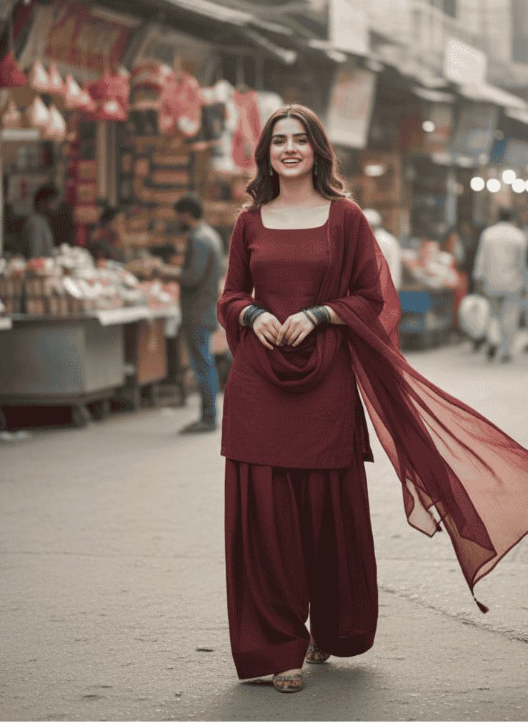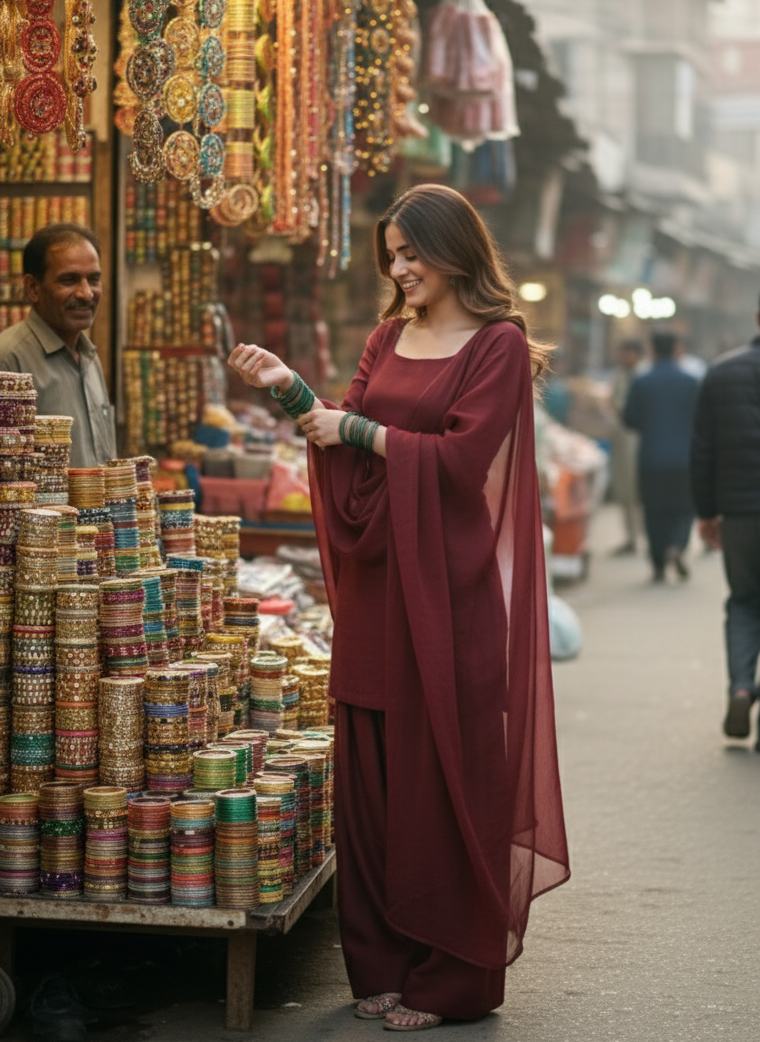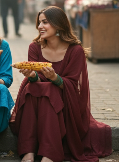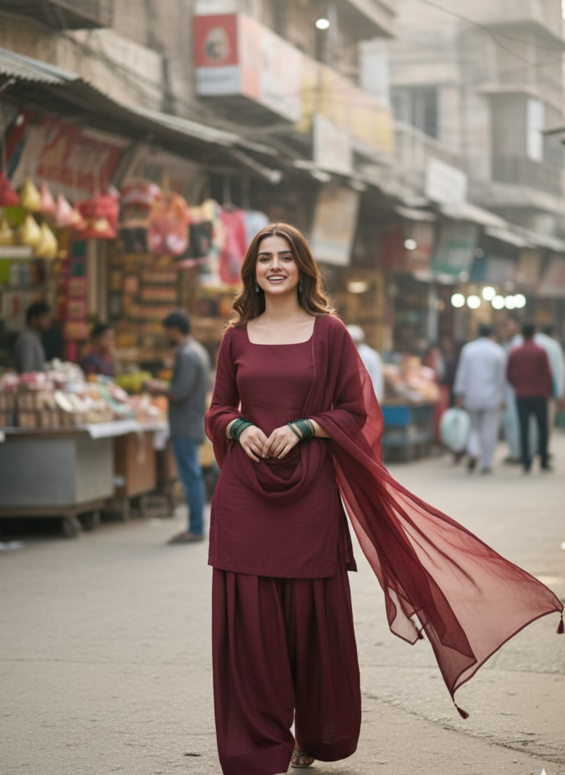 Elevate your wardrobe with this timeless Farshi Shalwar Kameez set crafted in premium Tassel silk. Designed for effortless grace, this three-piece ensemble features a relaxed, flowing silhouette with a Farshi-style shalwar and a matching above-elbow sleeve kameez. The look is completed with a lightweight organza dupatta, adding a soft, elegant finish to the solid base.